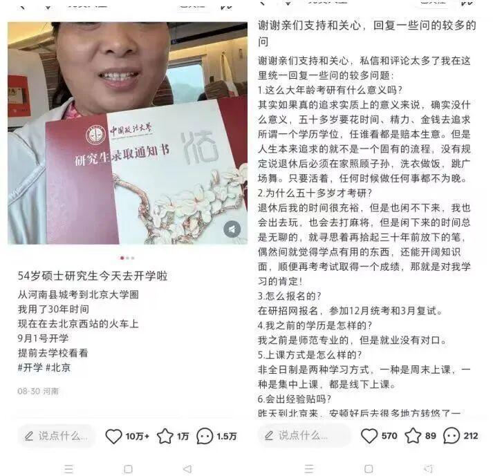 该网友称,“从河南县城考到北京大学圈,我用了30年时间,现在在去北京西站的火车上,9月1号开学,提前去学校看看。”其还专门解释大龄考研的意义,“人生本来追求的就不是一个固有的流程,任何时候做任何事都不为晚。”